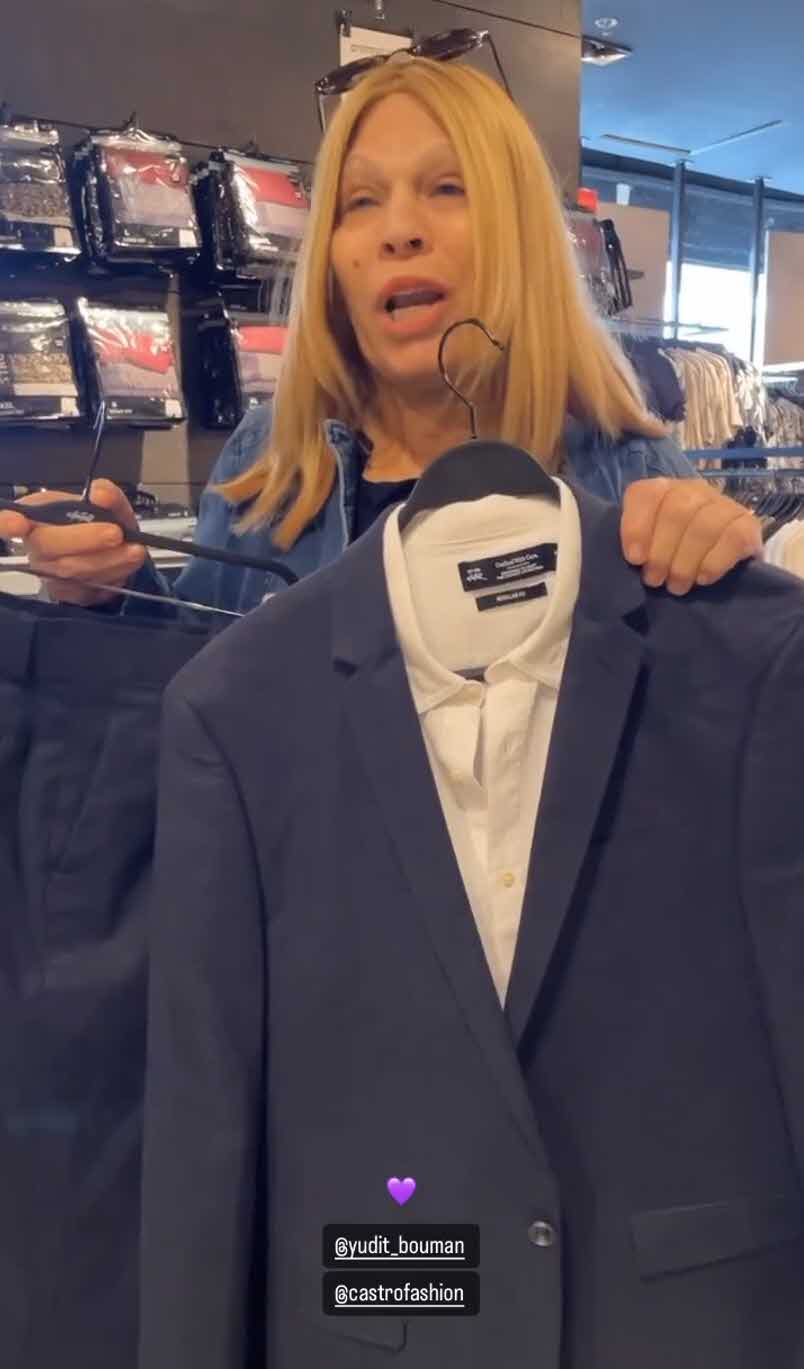 "מה שאני עושה זה לקחת את מקומו, נוסעת לקסטרו בדיזינגוף סנטר, זה המקום עם הבגדים שהכי מתאימים לפי האופנה, וקונה לו. הבעיה שהוא מתעצבן עלי ואחרי שעה הוא כבר מתרכך ושמח!"