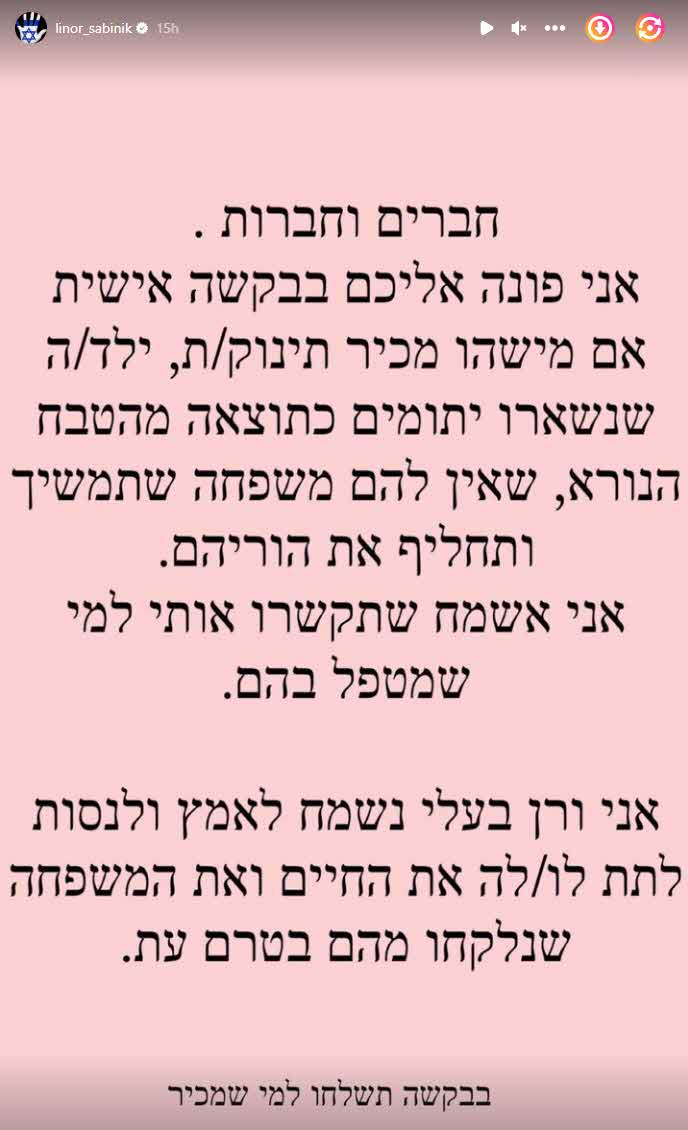 לינור כתבה בסטורי:"חברים וחברות. אני פונה אליכם בבקשה אישית. אם מישהו מכיר תינוק/ת, ילד/ה שנשארו יתומים כתוצאה מהטבח הנורא, שאין להם משפחה שתמשיך ותחליף את הוריהם."