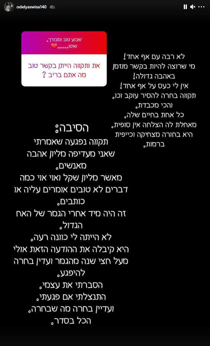 סויסה חשפה בסטורי נפרד שהיא "לא!!" בקשר עם גדעון ואז הוסיפה כתשובה לעוקבת אחרת את הסיבה לכך מנקודת המבט שלה כאשר נשאלה האם הם בריב: