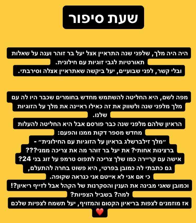 "מלך זילברשלג בראיון על הזוגיות עם החילונית" – ברצינות אחותי? את יעל בר זוהר, מה את צריכה ממני??? אישה עם קריירה כמו שלך צריכה לתפוס טרמפ על זוג בני 24? גם כתבתי לה כמובן בפרטי, היא פשוט בחרה להתעלם, כי אם אני לא אייטם אני כנראה שקופה. וכמובן שאני מבינה את העניין והסקרנות של הקהל אבל לזייף ראיון?! למה? בשביל הצפיות? אז מוזמנים לצפות בריאיון הקסום והמזויף, יעל תשמח לצפיות שלכם".