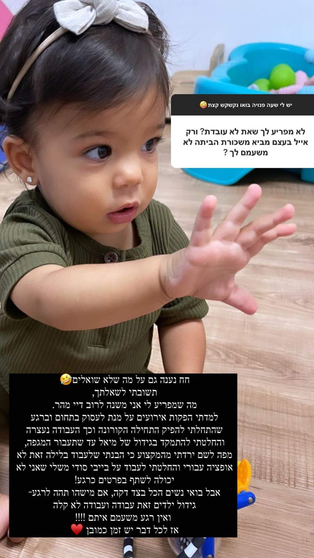 וסגרה לשואלת השאלה הנועזת את הפינה:"אבל בואי נשים הכל בצד דקה, אם מישהו תהה לרגע גידול ילדים זאת עבודה ועבודה לא קלה ואין רגע משעמם איתם!!! אז לכל דבר יש זמן כמובן"