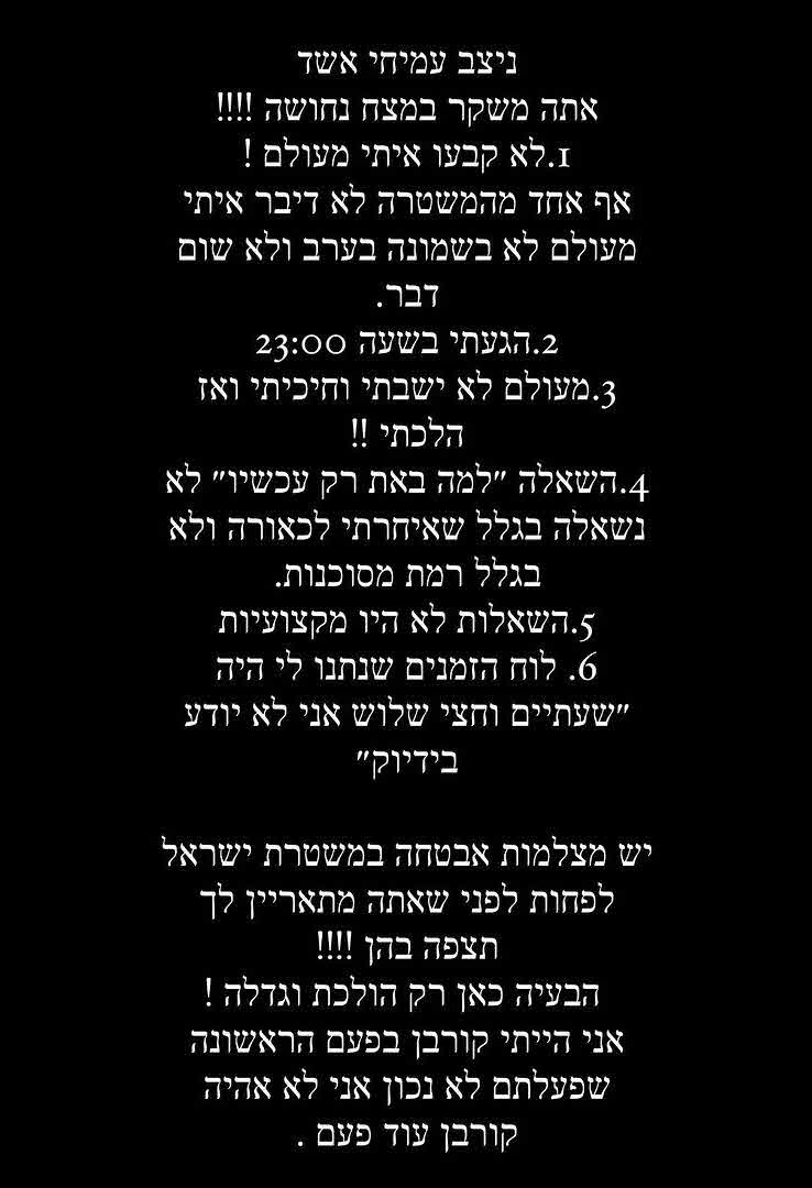 וסיימה בדברים הבאים:"יש מצלמות אבטחה במשטרת ישראל לפחות לפני שאתה מתאריין לך תצפה בהן !!!! הבעיה כאן רק הולכת וגדלה ! אני הייתי קורבן בפעם הראשונה שפעלתם לא נכון אני לא אהיה קורבן עוד פעם".