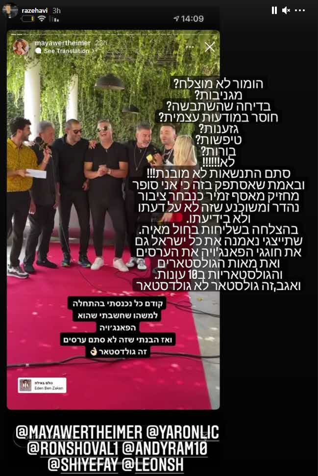 מאיה העלתה סטורי ובו רואים את סגל הנבחרים של "גולסטאר" על השטיח האדום כאשר הגיע לקבלת הפרס לצד הכיתוב:"קודם כל נכנסתי בהתחלה למשהו שחשבתי שהוא הפאנג'ויה ואז הבנתי שזה לא סתם ערסים זה גולסטאר" דבר שהביא את רז זהבי למתקפה על דבריה של מאיה בסטורי משלו!
