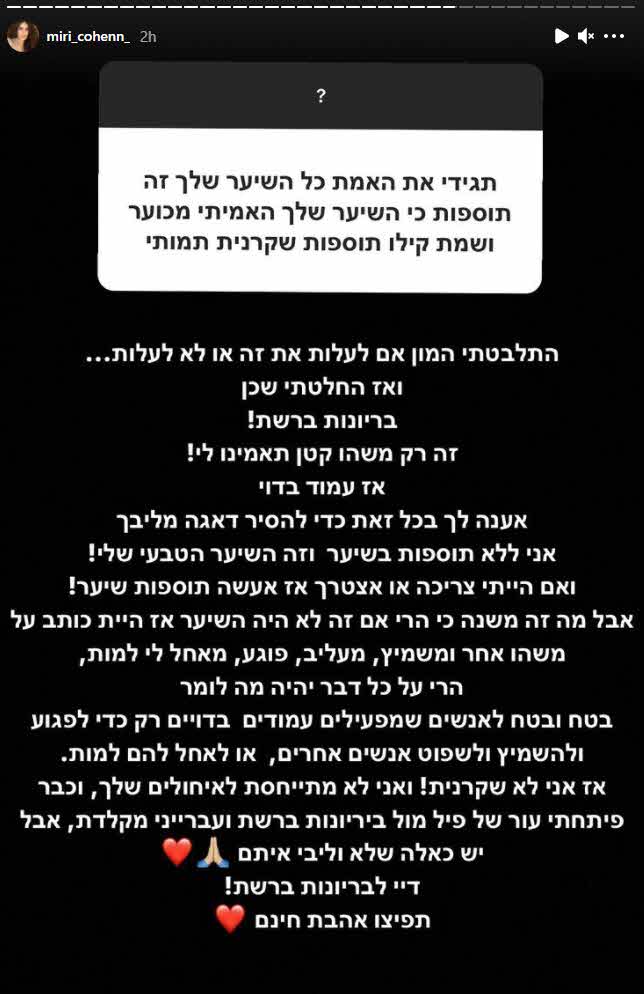 מירי שלא נשארה חייבת שיתפה את התגובה של אותה העוקבת וכתבה לה בתגובה בשיתוף לעוקבים:"התלבטתי המון אם להעלות את זה או לא להעלות… ואז החלטתי שכן." והוסיפה:"בריונות ברשת! זה רק משהו קטן תאמינו לי! אז עמוד בדוי אענה לך בכל זאת כדי להסיר דאגה מליבך. אני ללא תוספות בשיער וזה השיער הטבעי שלי!"