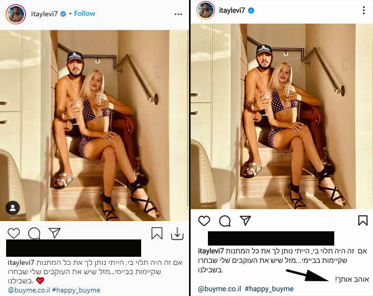 היה נדמה לעוקביו הזריזים של איתי לוי שלמרות זמן ההכרות האומנם לא ארוך מדי של השניים שכבר יש פה הצהרת כוונות ברורה מצד לוי כאשר העלה פוסט ובו כתב:"אם זה היה תלוי בי, הייתי נותן לך את כל המתנות שקיימות בביימי… מזל שיש את העוקבים שלי שבחרו בשבילנו. אוהב אותך" – רק כמה דקות לאחר מכן לוי החליט להסיר את צמד המילים "אוהב אותך" מהפוסט וגרם ללא מעט ספקולציות ברשת.