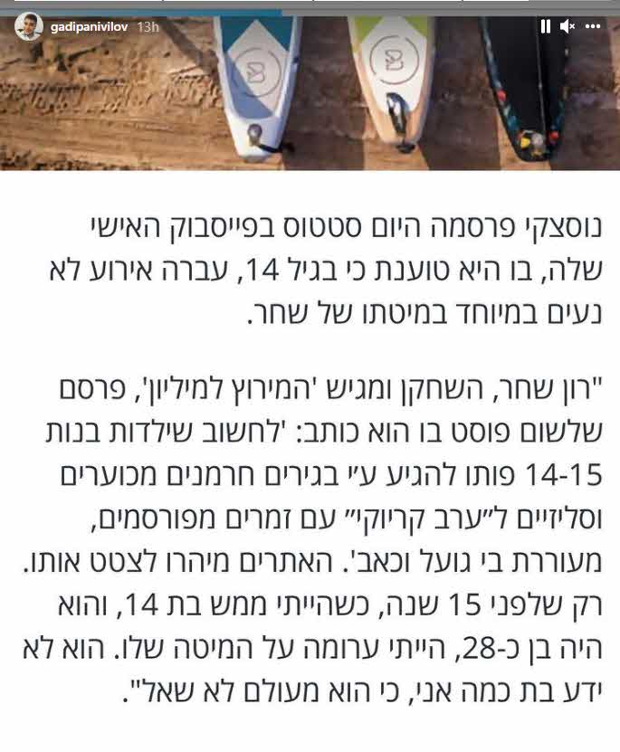 גדי שעשה קצת שיעורי בית בעניינו של רון מצא את הפוסט של שיר נוסצקי בפייסבוק מ-2013 ובו טענה כלפי רון שחר:"רק שלפני 15 שנה, כשהייתי ממש בת 14, והוא היה בן כ-28, הייתי ערומה על המיטה שלו. הוא לא ידע בת כמה אני, כי הוא מעולם לא שאל."