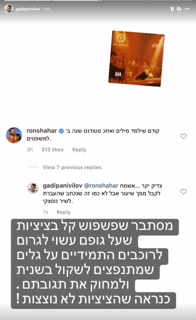 אך בין כל התגובות שספג גדי ברשתות החברתיות לרבות בפוסט של ישראל בידור, הייתה תגובה אחת של מנחה "המירוץ למיליון" רון שחר שהחליט להגיב לפוסט תגובה שפגעה בגדי וכתב:"קודם שילמד מילים ואחכ סטודנט שנה ב' למשפטים". אך הפעם גדי לא נשאר חייב כלל והחליט לענות לו בצורה שגרמה לתגובה המקורית להימחק?