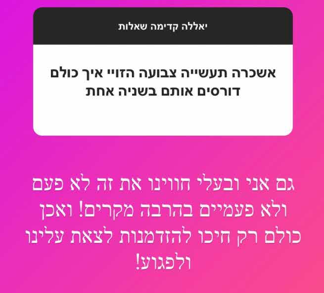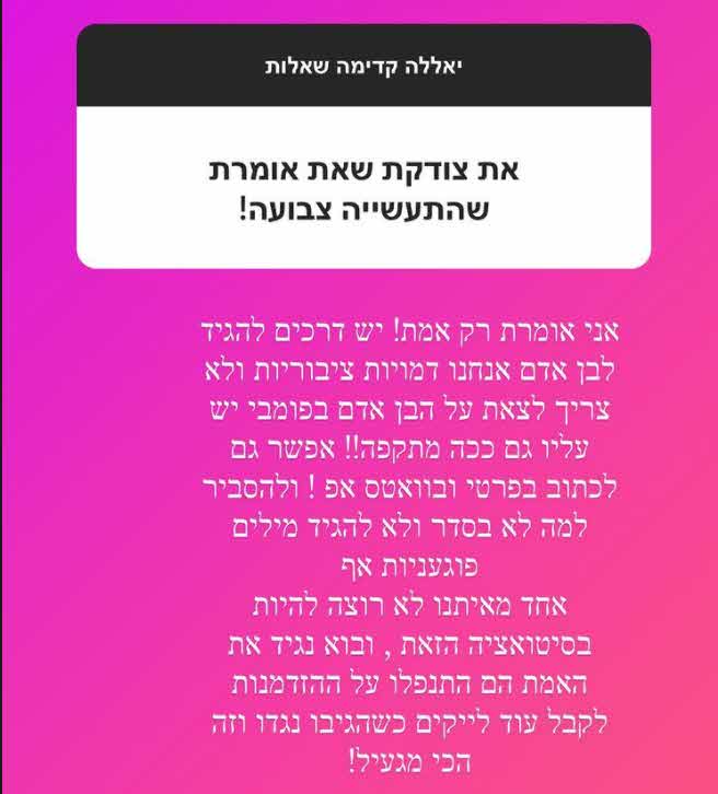 והוסיפה:"אף אחד מאיתנו לא רוצה להיות בסיטואציה הזאת, ובוא נגד את האמת. הם התנפלו על ההזדמנות לקבל עוד לייקים כשהגיבו נגדו וזה הכי מגעיל!"