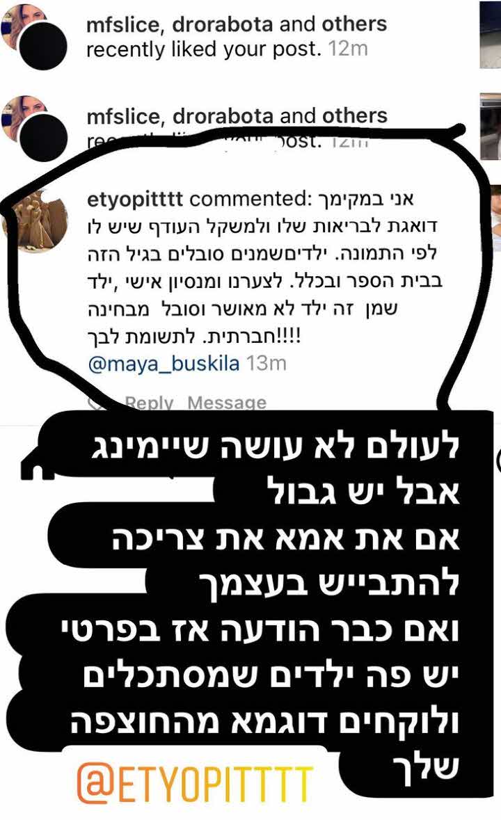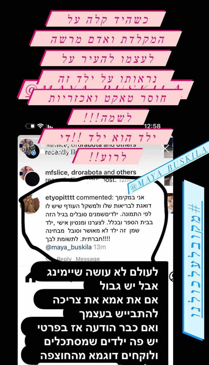 מאיה שלא יכלה לשאת את התגובה הלא נעימה הזאת החליטה לשתף אותה בסטורי לצד תגובה משלה בנושא:"לעולם לא עושה שיימינג אבל יש גבול. אם את אמא את צריכה להתבייש בעצמך ואם כבר הודעה אז בפרטי. יש פה ילדים שמסתכלים ולוקחים דוגמא מהחוצפה שלך".
