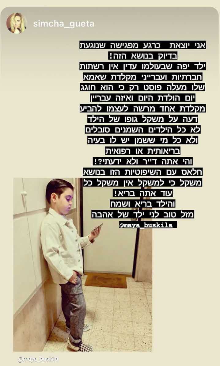 "החיים שלנו יותר חשופים, הסיפור שלו ידוע לכולם שיתפתי הבוקר תמונה שלו שאני אוהבת מאד, איחלתי לו מזל טוב זה בוקר כל כך מרגש עבור אמא.. מי כמוכן יודעות ובין המברכים, הייתה מקללת שביקרה וכתבה על משקל הגוף של הבן שלי, וכמה זה בעיניה לא בריא ואם היה לו אינסטגרם? ואם הוא יתקל בתגובה הזאת. נשברתי הלב שלי שבור הידיים שלכם קלות על המקלדת, אני אספוג הכל אבל עד הבן שלי מזל טוב לאהבת חיי שאמא תאהב אותך עם כרס או בלי, ומה ששלנו נפתור ביננו ילד קסם"