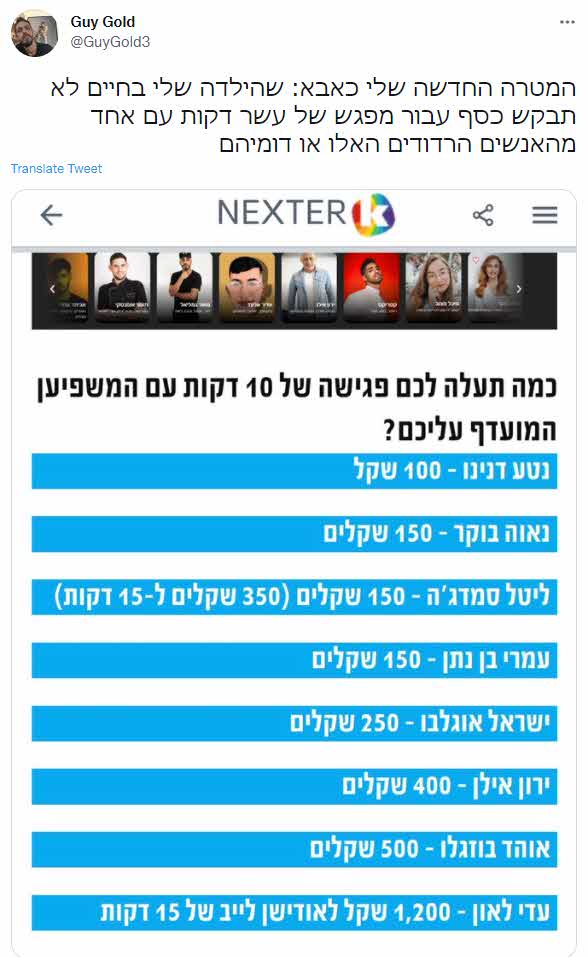 כוכב העונה הרביעית של "הישרדות" ואיש הקריאייטיב גיא גולד יצא בחשבון הטוויטר שלו בציוץ כנגד התופעה החדשה של תשלום בעבור מפגש וידאו וירטואלי קצר עם הידוענים המתפרסמים באפליקציה לצד המחירון המתפרסם ברשת וכתב:"המטרה החדשה שלי כאבא: שהילדה שלי בחיים לא תבקש כסף עבור מפגש של עשר דקות עם אחד מהאנשים הרדודים האלו או דומיהם".