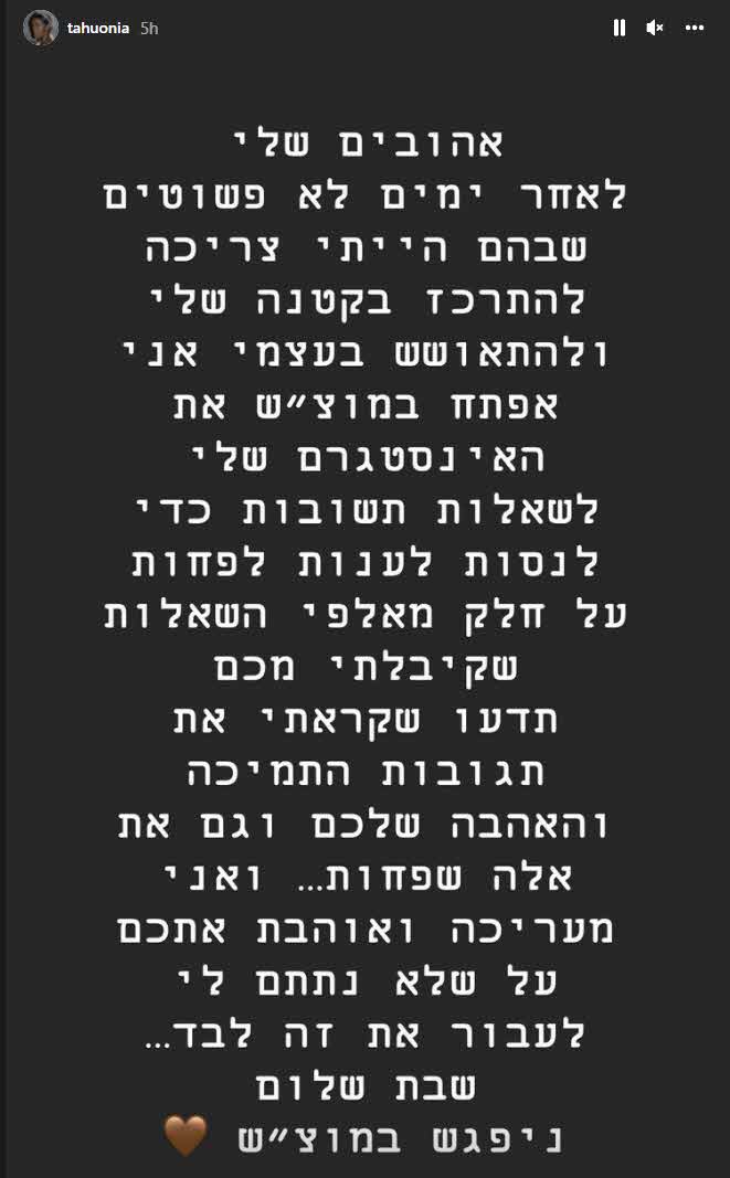 אך כמובן שהלהבות בסאגה מול טהוניה עדיין לא התקררו למרות הבשורות הטובות והמשמחות בגזרת הזוג החדש והמאוהב. טהוניה העלתה סטורי ראשון שמתייחס לפרשה ואף חשפה לעוקביה שתפתח במוצ"ש הקרוב את האינסטגרם שלה לשאלות ותשובות בנושא:"אהובים שלי לאחר ימים לא פשוטים שבהם הייתי צריכה להתרכז בקטנה שלי ולהתאושש בעצמי אני אפתח במוצ'ש את האינסטגרם שלי לשאלות תשובות כדי לנסות לענות לפחות על חלק מאלפי השאלות שקיבלתי מכם"