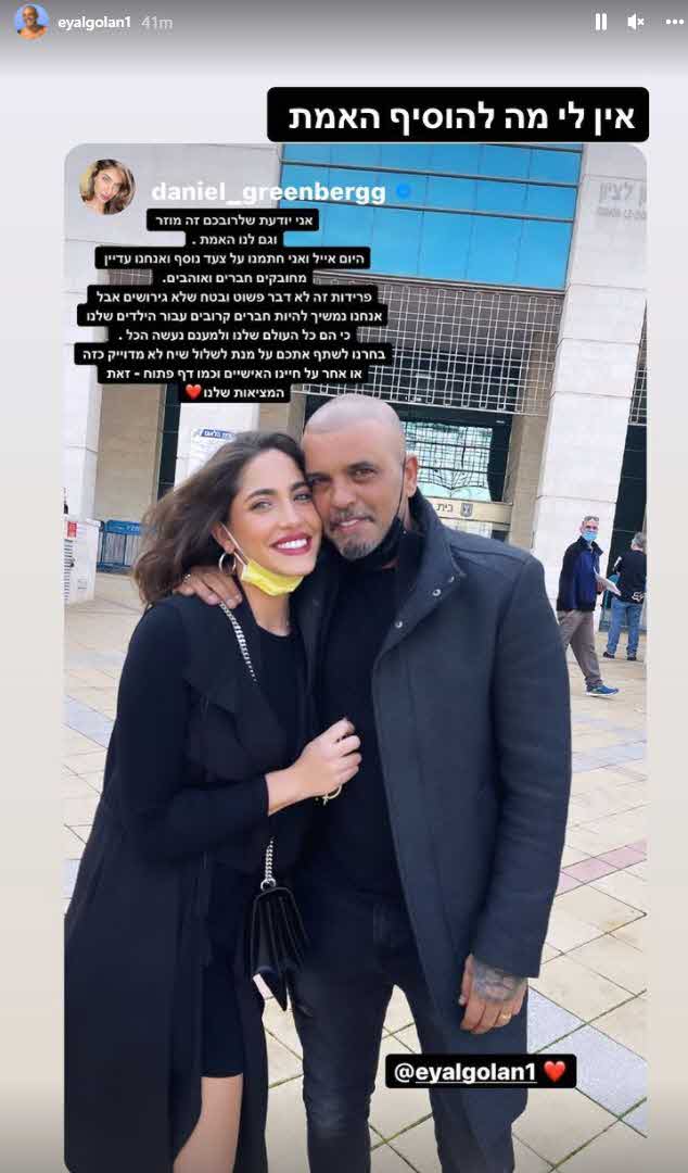 אייל גולן ודניאל גרינברג הצטלמו ביציאה מבית המשפט כאשר הם נראים מחויכים ומעט אדישים אולי לסיטואציה המורכבת הזו אותה הם החליטו לקחת בצורה הכי חברית שיש. דניאל הוסיפה לעוקבים:"אני יודעת שלרובכם זה מוזר וגם לנו האמת."