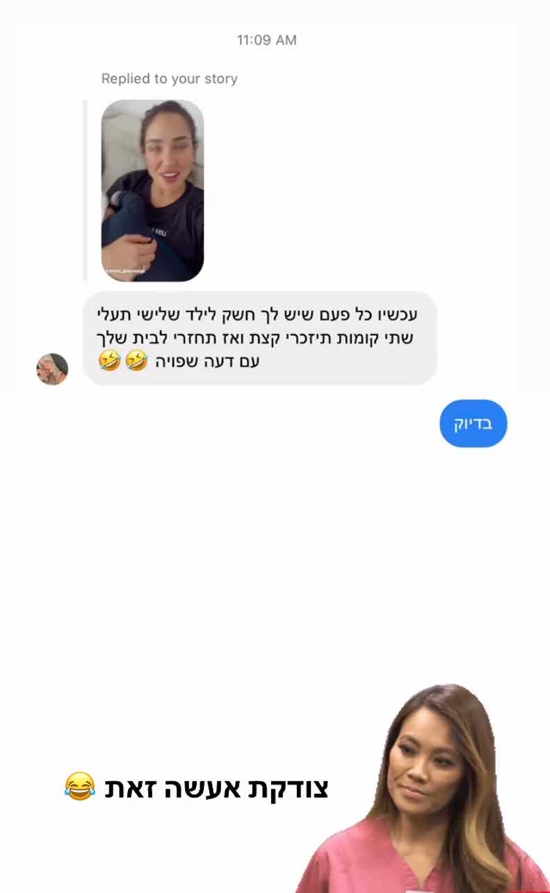 "בבקשה אחותי המתוקה שעברה לגור 2 קומות מעלי. הזכירה לי מה זה להיות בבוקר עם תינוק ושאת לא יכולה לעשות כלום בבית. תודה רבה אחותי על החוויה" וזה נאמר כמובן בהלצה או רמיזה לבאות.