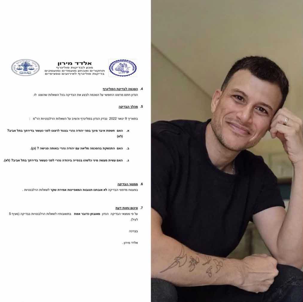 בבדיקה שבוצעה אמש ע"י אסי עזר הוא השיב בחיוב לשאלה:"האם התנשקת בהסכמה מליאה עם יהודה נהרי באותה הפגישה". אך מנגד ענה בשלילה לשאלות:"האם חשפת איבר מינך בפני יהודה נהרי בנגוד לרצונו לפני כעשור בדירתך בתל אביב?" וגם לשאלה:"האם עשית מעשה מיני כלשהו בכפייה ביהודה נהרי לפני כעשור בדירתך בתל אביב?"