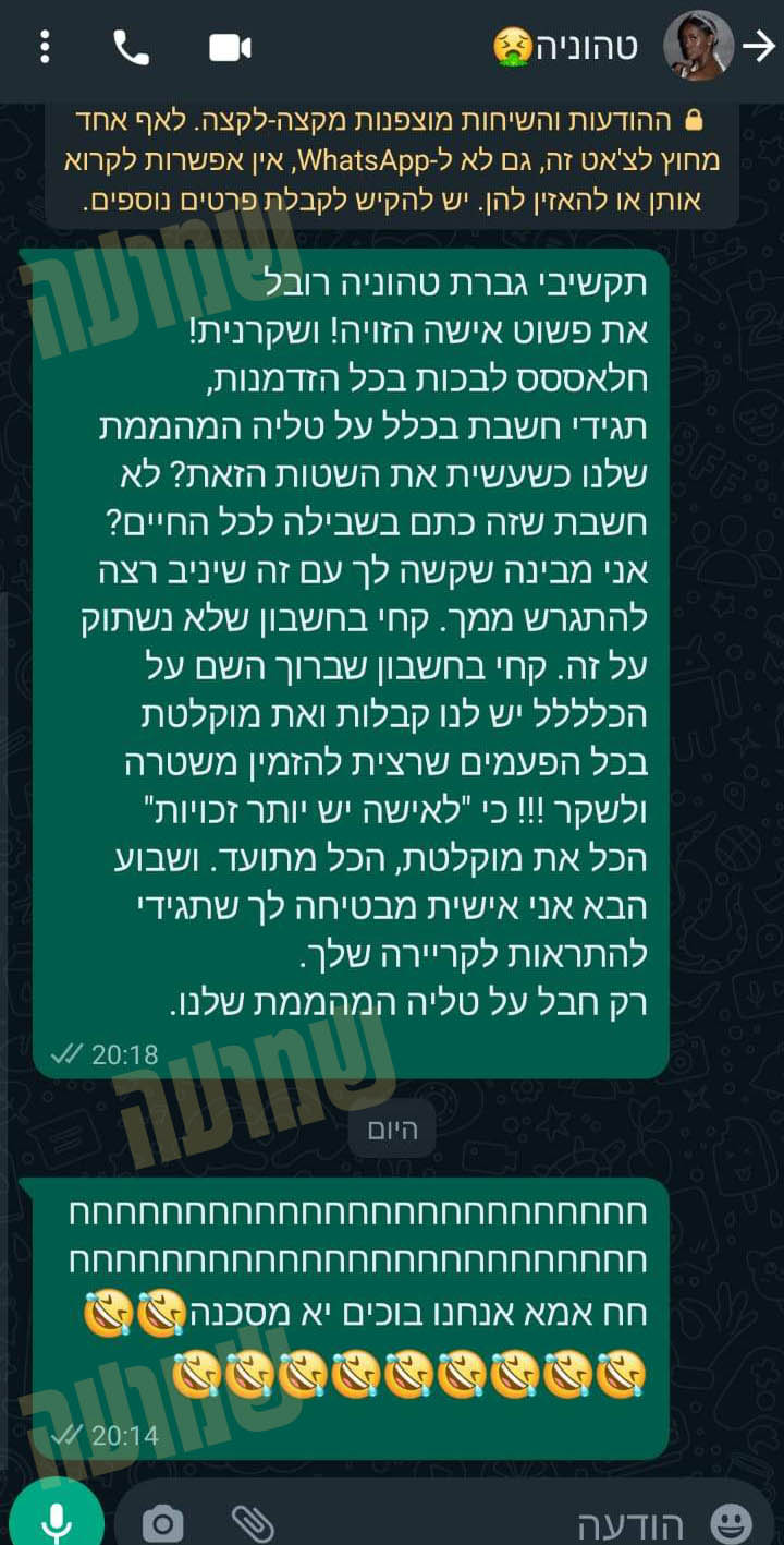 והוסיפה הודעה נוספת לאחר הידיעה שהיא מתכוננת לתבוע אותה:"חחחחחחחחחחחחחח אמא אנחנו בוכים יא מסכנה".