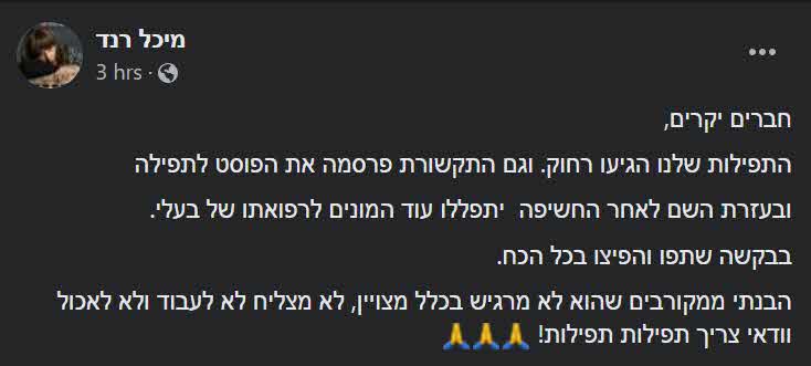 והוסיפה:"הבנתי ממקורבים שהוא לא מרגיש בכלל מצוין, לא מצליח לעבוד ולא לאכול. וודאי צריך תפילות תפילות!"