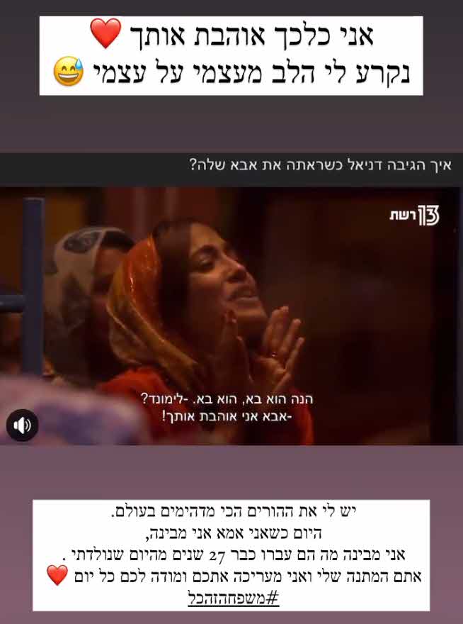 "אני מבינה מה הם עברו כבר 27 שנים מהיום שנולדתי. אתם המתנה שלי ואני מעריכה אתכם ומודה לכם כל יום". לצד התיוג שחתם את שרשרת הסטוריז המרגשת #משפחה זה הכל.