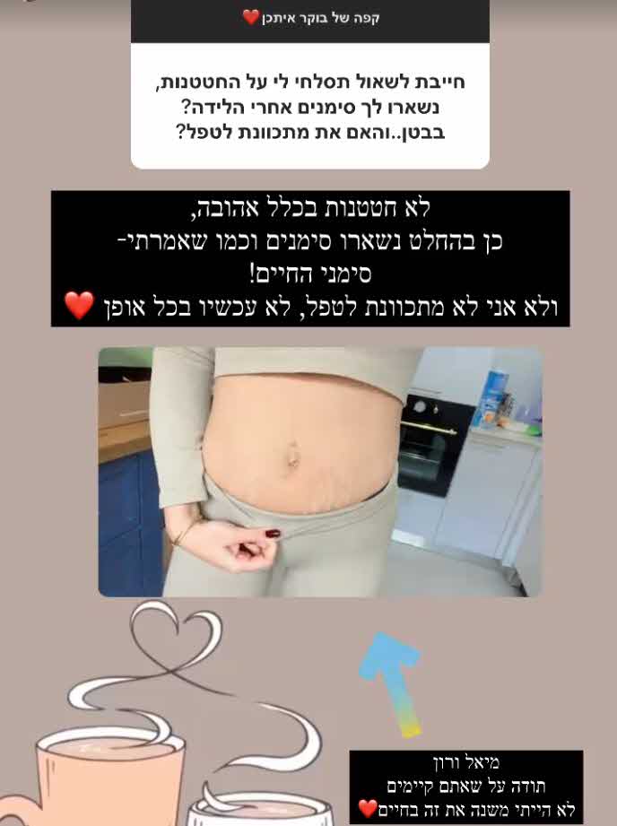 עוקבת נוספת הסתקרנה לגבי סימני המתיחה בבטנה של דניאל גרינברג לאחר הלידה. האם נותרו כאלה והאם היא מתכוונת לטפל או לעבור ניתוח קוסמטי כדי להעלימם. דניאל שלא נרתעה מהשאלה החטטנית חשפה וידאו שלה עם סימני המתיחה וענתה:"לא חטטנות בכלל אהובה, כן בהחלט נשארו סימנים וכמו שאמרתי- סימני החיים! ולא אני לא מתכוונת לטפל, לא עכשיו בכל אופן".
