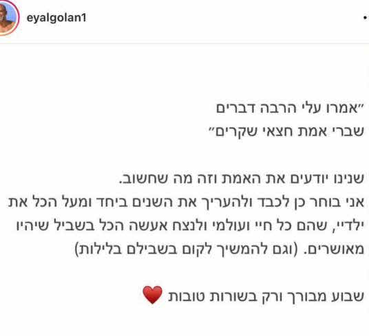 גולן עצמו כתב לאחר פרסום הראיון של דניאל בתקשורת:"'אמרו עלי הרבה דברים שברי אמת חצאי שקרים' שנינו יודעים את האמת וזה מה שחשוב. אני בוחר כן לכבד ולהעריך את השנים ביחד ומעל הכל את ילדיי, שהם כל חיי ועולמי ולנצח אעשה הכל בשביל שיהיו מאושרים.(וגם להמשיך לקום בשבילם בלילות)"