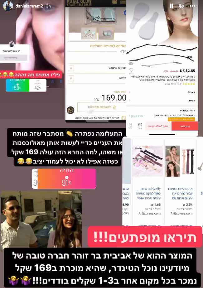 "התעלומה נפתרה. מסתבר שזה מותח את העניים כדי לעשות אותן מלוכסנות או משהו, למה החרא הזה עולה 169 שקל כשזה אפילו לא יכול לעמוד יציב" כתב דניאל ואז ביצע השוואה נוספת של המוצר מהאתר של אביבית לעומת מוצר אחר בעליאקספרס.