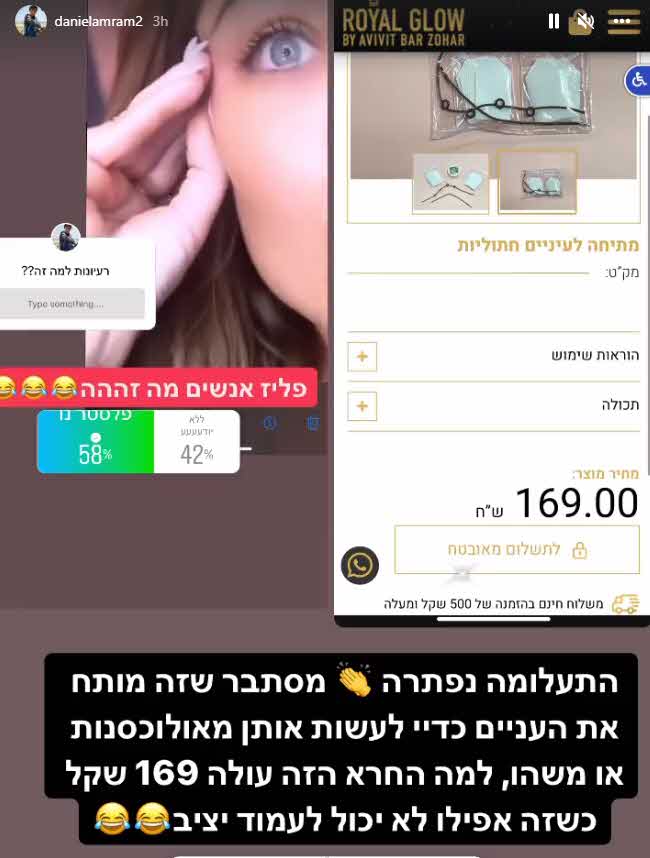 ואז במהלך הצפייה בסטוריז של אביבית, קלט שהיא משחקת עם סוג של מוצר טיפוח קרוב לאיזור העין שלה, דבר שהצליח לגרור את סקרנות העוקבים בתהייה לגבי המוצר המדובר. שלכאורה מדובר באחד המוצרים של אביבית הנקרא "מתיחה לעיניים חתוליות". גם על זה דניאל לא היסס וביקר.