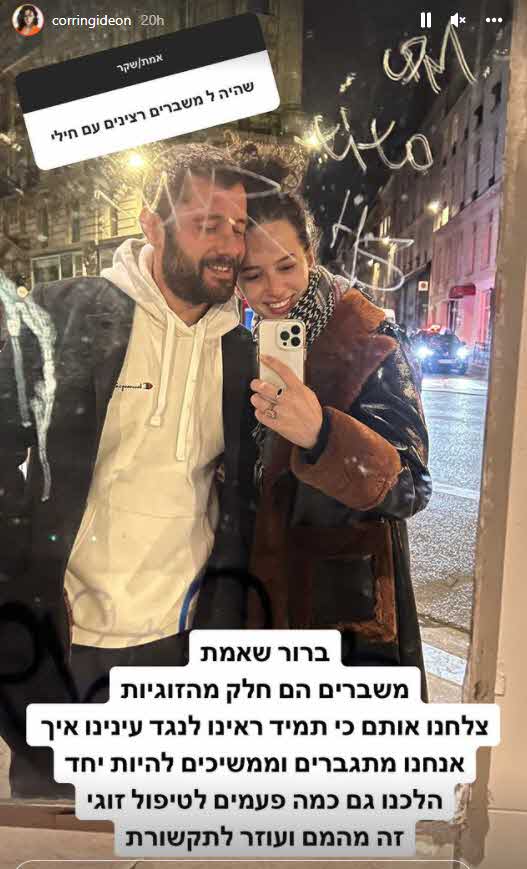 אחת משאלות האמת או שקר שעליהן החליטה קורין לענות הייתה "היו לך משברים רציניים עם חילי?". היא החליטה לענות באופן חד משמעי "ברור שאמת" והוסיפה:"משברים הם חלק מהזוגיות. צלחנו אותם כי תמיד ראינו לנגד עינינו איך אנחנו מתגברים וממשיכים להיות יחד. הלכנו גם כמה פעמים לטיפול זוגי. זה מהמם ועוזר לתקשורת"