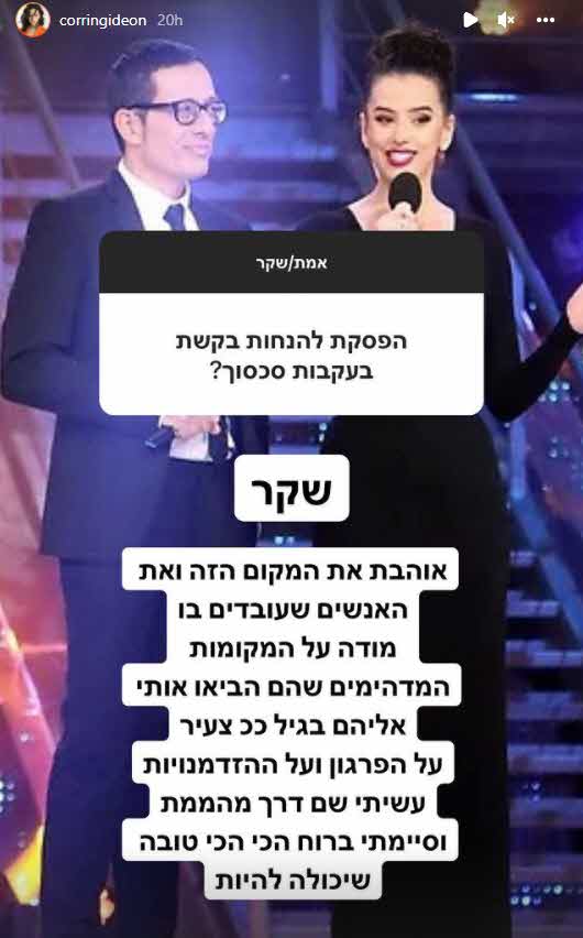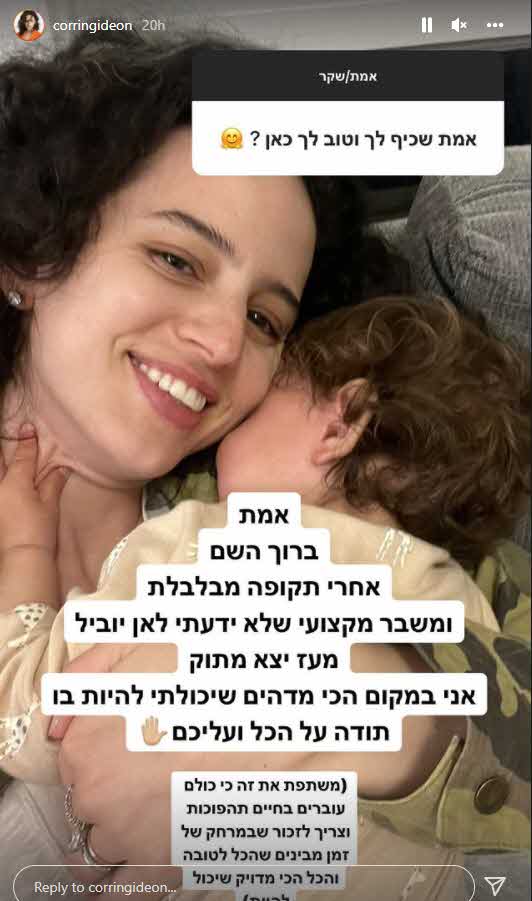 ומה לגבי התקופה בה היא נמצאת בחייה שכזכור, רק לאחרונה סיפרה על הזמנים הקשים בה מצאה את עצמה ללא עבודה לאחר עידן ה"טלוויזיה" שלה. קורין סיפרה:"ברוך השם אחרי תקופה מבלבלת ומשבר מקצועי שלא ידעתי לאן יוביל מעז יצא מתוק. אני במקום הכי מדהים שיכולתי להיות בו. תודה על הכל ועליכם."