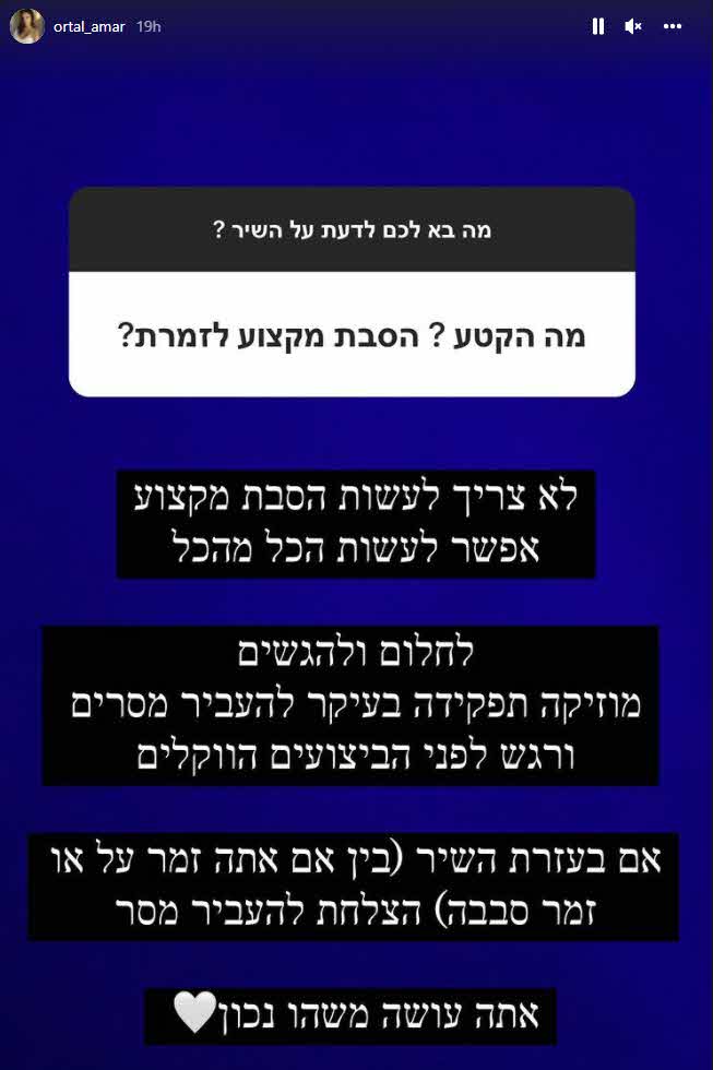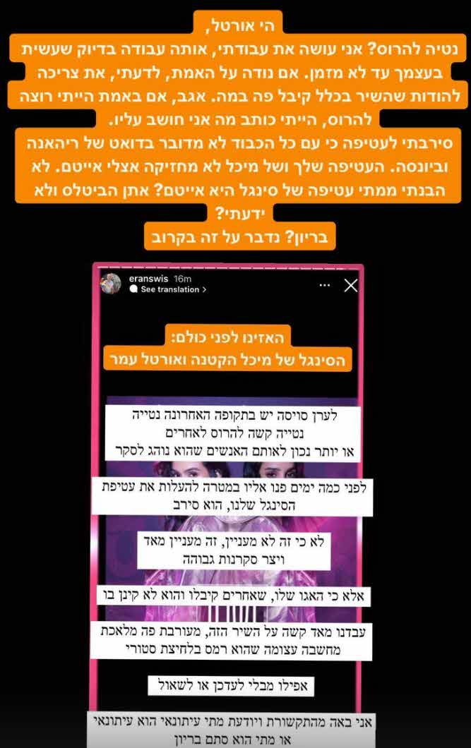 וסיכמה בחריפות:"עבדנו מאד קשה על השיר הזה, מעורבת פה מלאכת מחשבה עצומה שהוא רמס בלחיצת סטורי. אפילו מבלי לעדכן או לשאול. אני באה מהתקשורת ויודעת מתי עיתונאי הוא עיתונאי או מת הוא סתם בריון"
