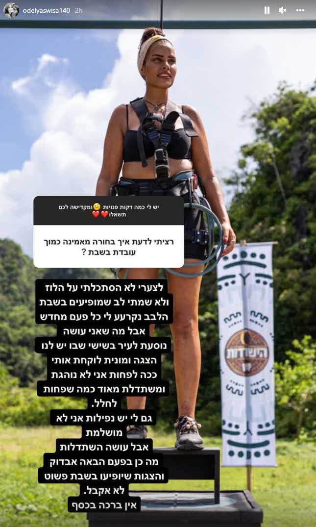 אודליה נשאלה ע"י אחד מעוקביה:"רציתי לדעת איך בחורה מאמינה כמוך עובדת בשבת?". אודליה הגיבה חיש מהר לאותו עוקב או עוקבת:"לצערי לא הסתכלי על הלוז ולא שמתי לב שמופיעים בשבת."