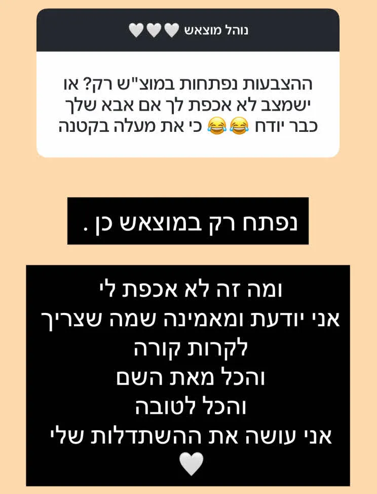 "ומה זה לא אכפת לי? אני יודעת ומאמינה שמה שצריך לקרות קורה והכל מאת השם והכל לטובה. אני עושה את ההשתדלות שלי".