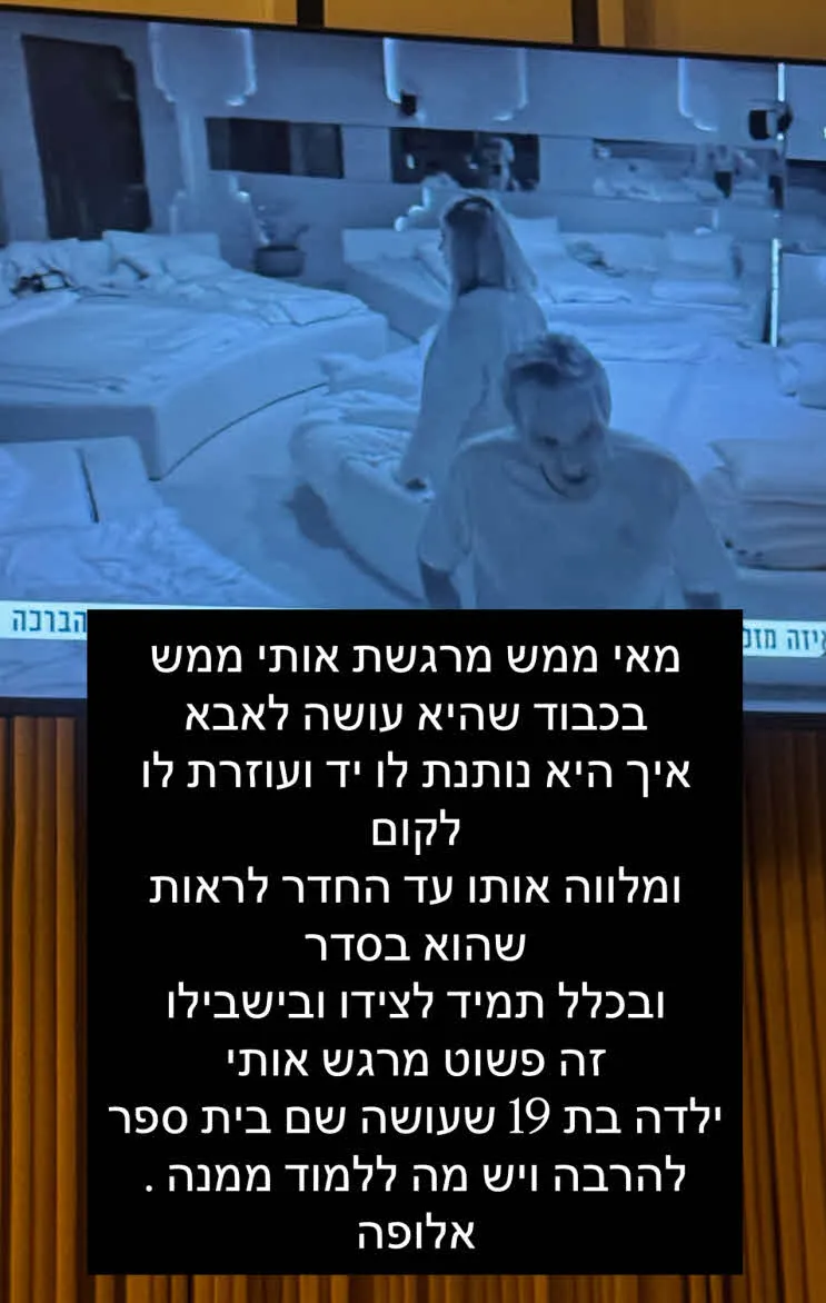 "מאי ממש מרגשת אותי בכבוד שהיא עושה לאבא. איך היא נותנת לו יד ועוזרת לו לקום ומלווה אותו עד החדר לראות שהוא בסדר. ובכלל תמיד לצידו ובשבילו, זה פשוט מרגש אותי. ילדה בת 19 שעושה שם בית ספר להרבה ויש מה ללמוד ממנה, אלופה".