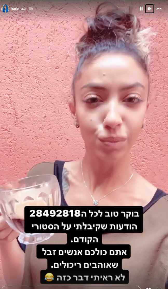 ונראה שהסטורי של קארין לא ממש הצליח לחמוק מתחת לרדאר, כבר כשקמה לבוקר שאחרי הסטוריז בהם יצאה על האקס קיבלה כמות אדירה של הודעות בנושא. ואז היא החליטה להוסיף עוד קיסם אחרון למדורה.