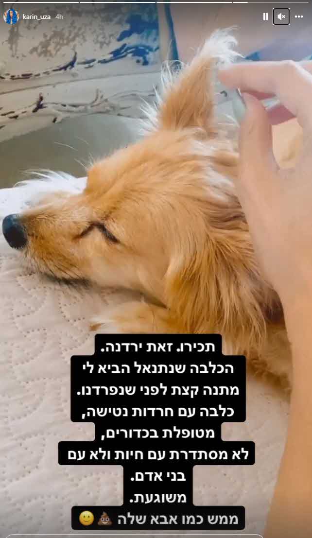 קארין חשפה את הכלבה שנתנאל הביא לה במתנה קצת לפני שנפרדו וטענה בעוקצניות:"כלבה עם חרדות נטישה, מטופלת בכדורים, לא מסתדרת עם חיות ולא עם בני אדם. משוגעת. ממש כמו אבא שלה".