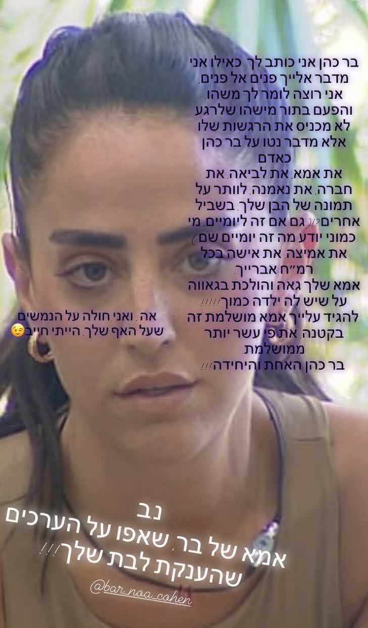 אליאב כתב:"בר כהן אני כותב לך כאילו אני מדבר אלייך פנים אל פנים. אני רוצה לומר לך משהו והפעם בתור מישהו שלרגע לא מכניס את הרגשות שלו אלא מדבר נטו על בר כהן כאדם. את אמא את לביאה את חברה את נאמנה לוותר על תמונה של הבן שלך בשביל אחרים (גם אם זה ליומיים)."