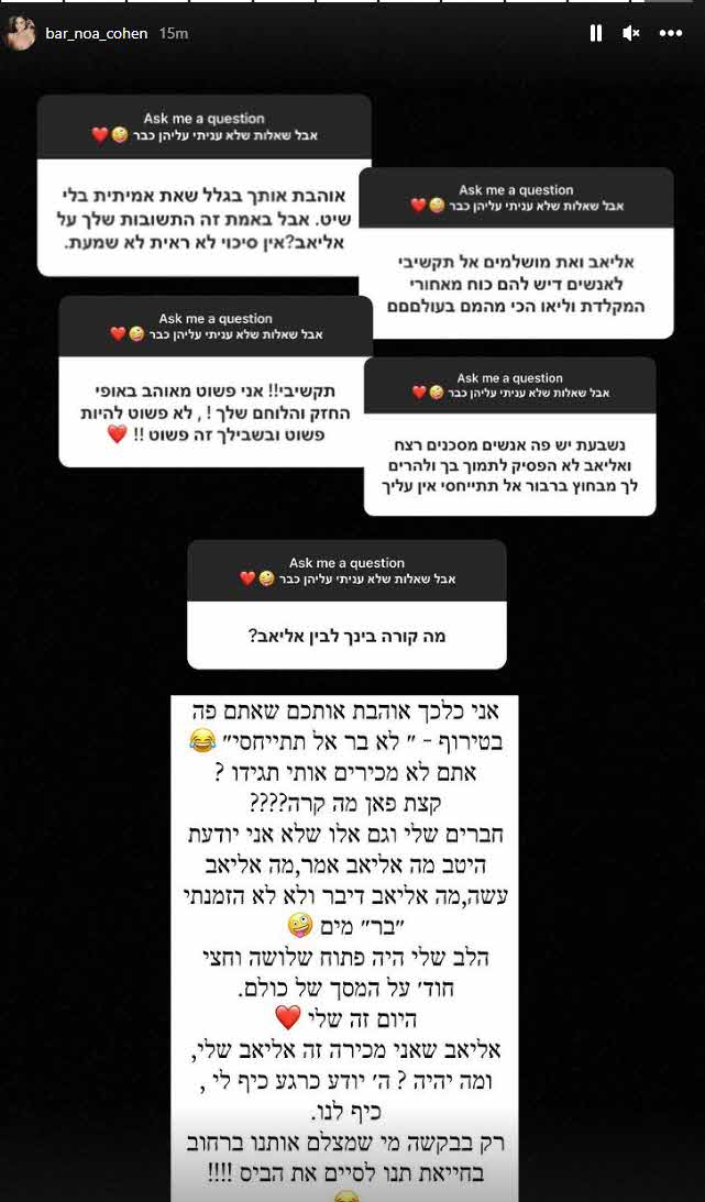 אך יותר מאוחר בר העלתה סטורי מסכם לגל הסטוריז בעניינו של אליאב וכתבה:"אני כלכך אוהבת אותכם שאתם פה בטירוף 'לא בר אל תתייחסי'. אתם מכירים אותי תגידו? קצת פאן מה קרה??? חברים שלי וגם אלו שלא, אני יודעת היטב מה אליאב אמר, מה אליאב עשה, מה אליאב דיבר ולא לא הזמנתי 'בר' מים"