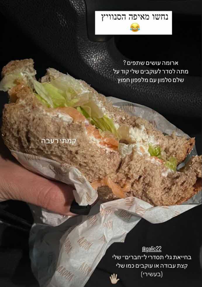 בר שיתפה בסטורי:"נחשו מאיפה הסנדוויץ. ארומה עושים שתפים? מתה לסדר לעוקבים שלי קוד על שלם סלמום עם מלפפון חמוץ – קמתי רעבה". תייגה את הסוכנת שלה גלי בראון וכתבה:"בחייאת גלי תסדרי ל'חברים' שלי קצת עבודה או עוקבים כמו שלי(בעשירי)".