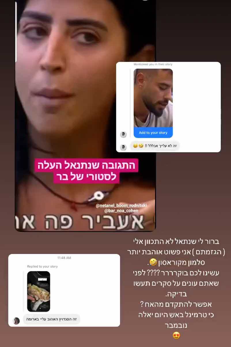 בר השיבה בסטורי נוסף:"ברור לי שנתנאל לא התכוון אלי(הגזמתם) אני פשוט אוהבת יותר סלמון מקרואסון. עשינו לכם בוקר? לפני שאתם עונים על סקרים תעשו בדיקה. אפשר להתקדם מהאח?"
