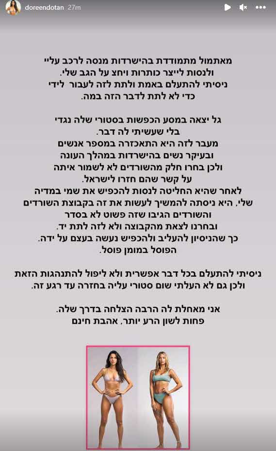 דורין דותן לא נשארה חייבת להאשמות האלה של גל רובין והחליטה לצאת בסטורי חריף משלה:"מאתמול מתמודדת בהישרדות מנסה לרכב עליי ולנסות לייצר כותרות ויחצ על הגב שלי. ניסיתי להתעלם באמת ולתת לזה לעבור לידי כדי לא לתת לדבר הזה במה."