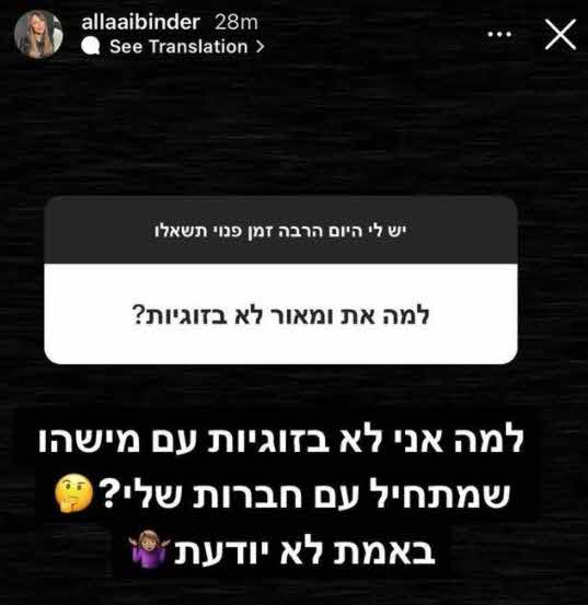 אלה החליטה להגיב לשאלה הבוערת של עוקביה: מדוע היא ומאור לא בזוגיות כפי שפורסם בכלי התקשורת השונים? ונראה שהתגובה שלה הייתה נחרצת במיוחד כולל עקיצה חריפה במיוחד:"למה אני לא בזוגיות עם מישהו שמתחיל עם חברות שלי? באמת לא יודעת".