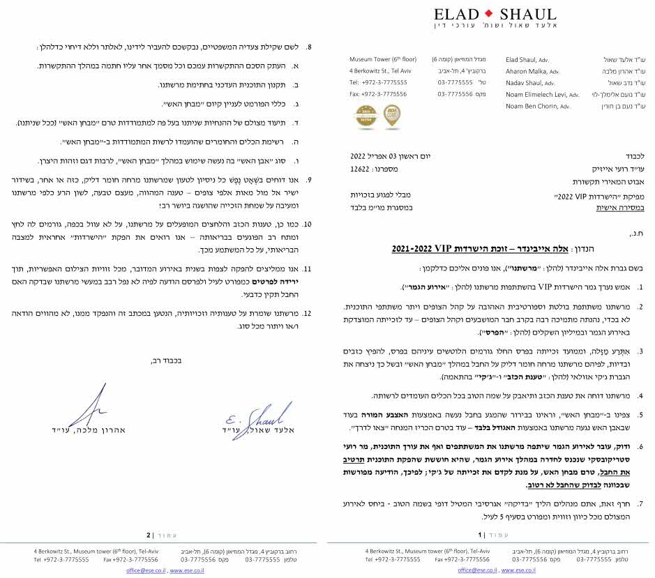 אלה אף שיגרה מכתב מעורך דינה ל"רשת" ובו דרשה לקבל את כל המסמכים עליהם היא חתומה כולל החוזה, התקנון של "הישרדות", הכללים ובעצם כל האינפורמציה עד הפרטים הקטנים ביותר כולל רשימת החומרים שהיו ברשותה במבחן האש ועוד.