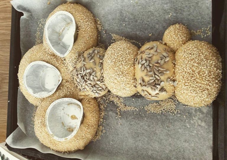 4לוקחים כדור בצק גדול ומרדדים אותו לנקניק ארוך ועושים ממנו צורה של בייגלה, שמים בכל עיגול תבנית מאפינס בכדי שבאפיה על מנת שלא יסגר באפייה.