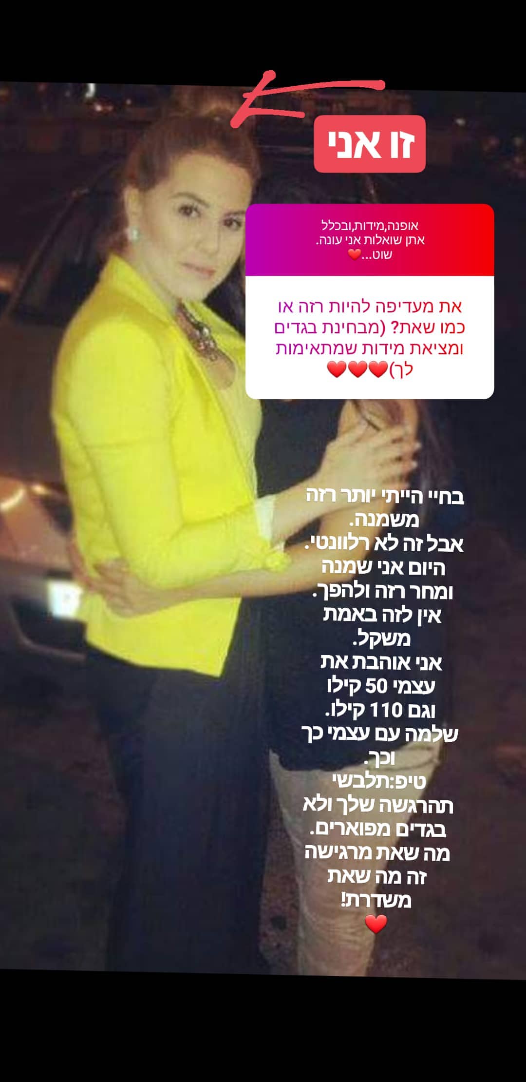 לפני 4 שנים אחרי גירושים הפכתי שמנה משם הפכתי לדוגמנית"פלאסייז" ומהמקום הזה למובילת דעת קהל..משם לתוכניות הטלוויזיה השונות..תוכנית רדיו יומית.ואפילו זכיתי להיות הפיינליסטית "השמנה" הראשונה בארץ וכנראה שגם בעולם.נתתי חלון הצצה שזה אפשרי.
