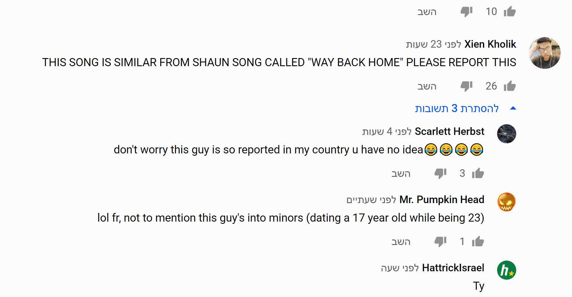 תגובות של אנשים ביקשו משאר הגולשים "לדווח" על שירו של זיני בעקבות הדמיון בין השיר של זיני לבין שיר אחר באנגלית בשם SHAUN – Way Back Home לא איחרו לבוא:
