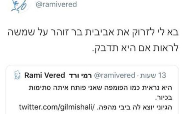 הציוץ של ורד אומנם נמחק לאחר מספר שעות אבל בתקשורת כמו בתקשורת, הציוץ שלו נגדה התפרסם בתקשורת כמו אש בשדה קוצים ואביבית שהחליטה שהעניין לא מקובל עליה החליטה להגיד נגדו תגיעה על פגיעה בשמה הטוב בסך 146,000 ש"ח, תביעה שהתיק שלה נסגר היום בבית משפט השלום בת"א וגזר הדין הוא שעל רמי ורד לשלם לאביבית פיצוי בסך 10,000 ש"ח + 3,700 ש"ח על שכר הטרחה ואגרות בית המשפט.