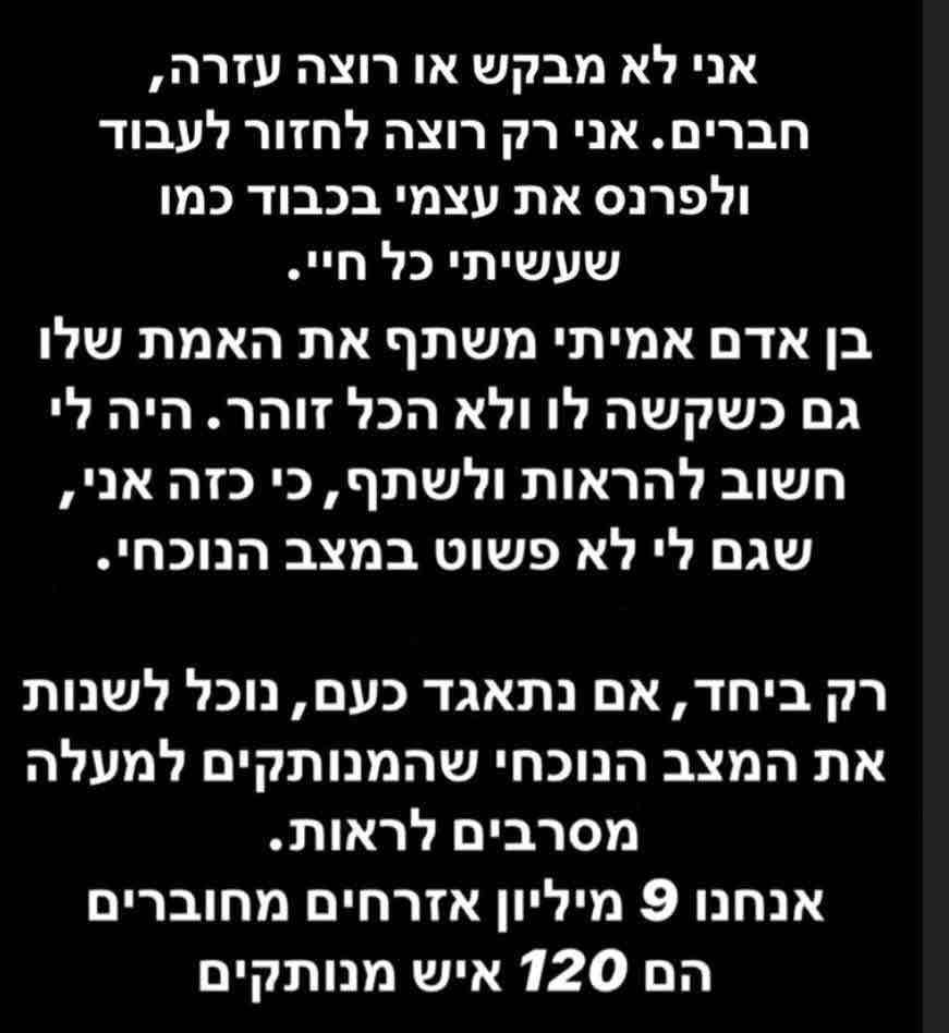 ואז הגיעה הסטורי הבא של מייקל ממש עכשיו:"אני לא מבקש או רוצה עזרה, חברים. אני רק רוצה לחזור לעבוד ולפרנס את עצמי בכבוד כמו שעשיתי כל חיי".