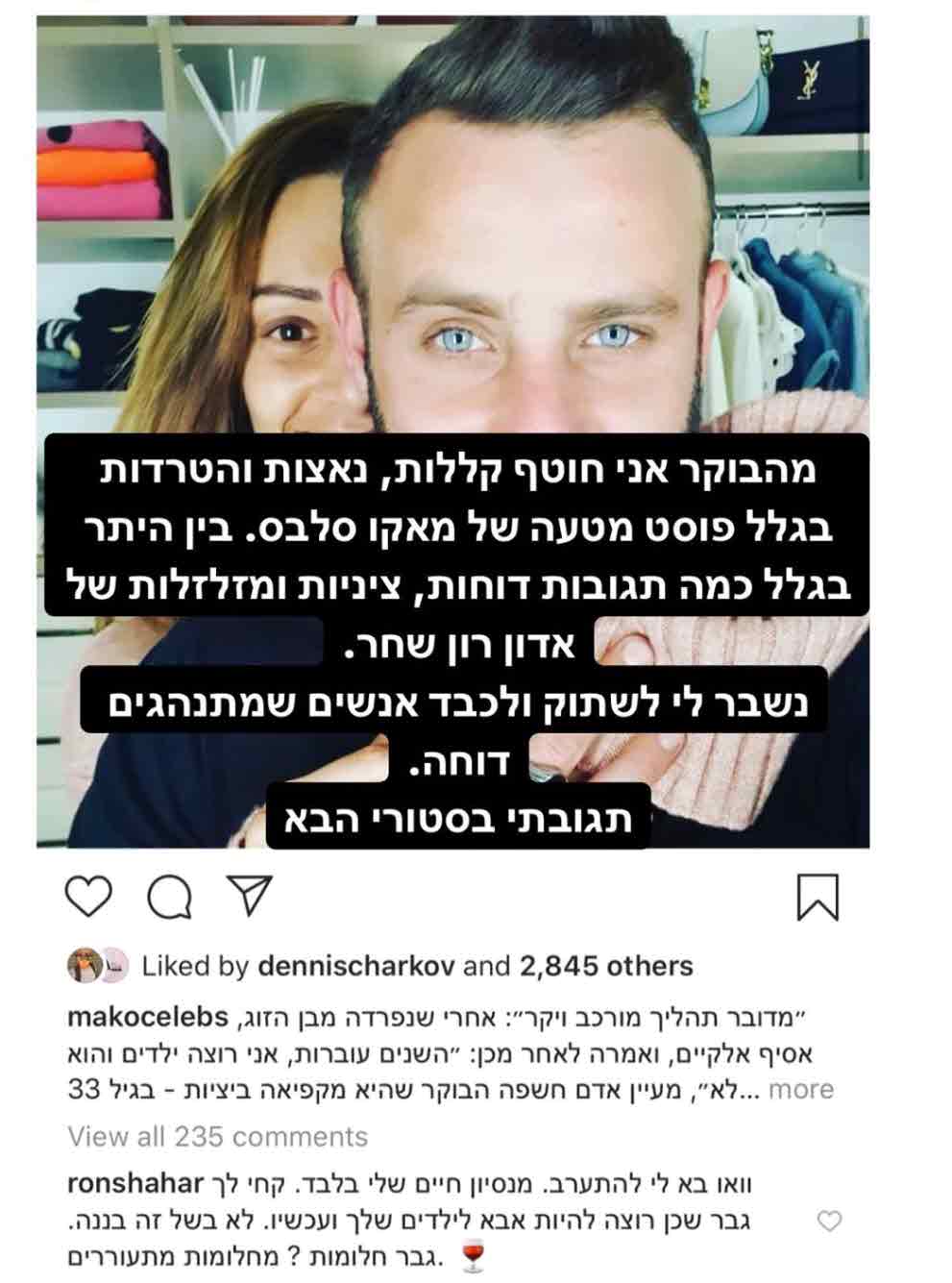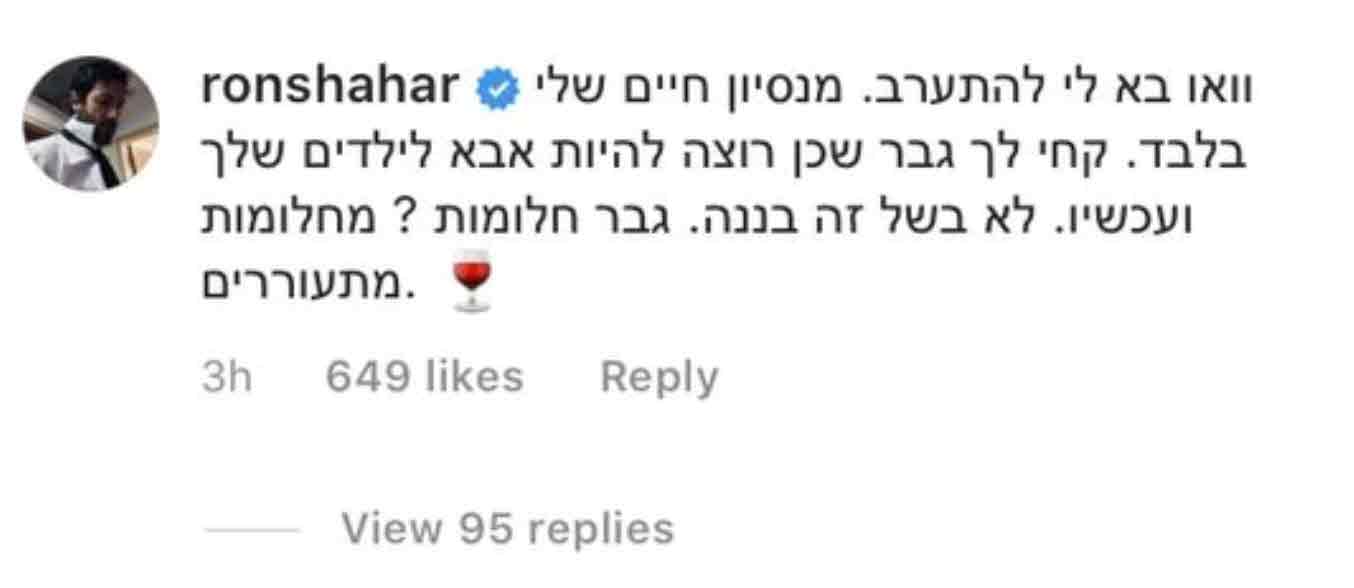 מה קרה כשמנחה "המירוץ למיליון" והשחקן רון שחר הרשה לעצמו להתערב ביחסים של אסיף ומעיין בתגובה לפוסט "הקפאת הביציות" של מעיין אדם? הוא בטוח לא ציפה לתגובה כזאת חריפה חזרה מאסיף!