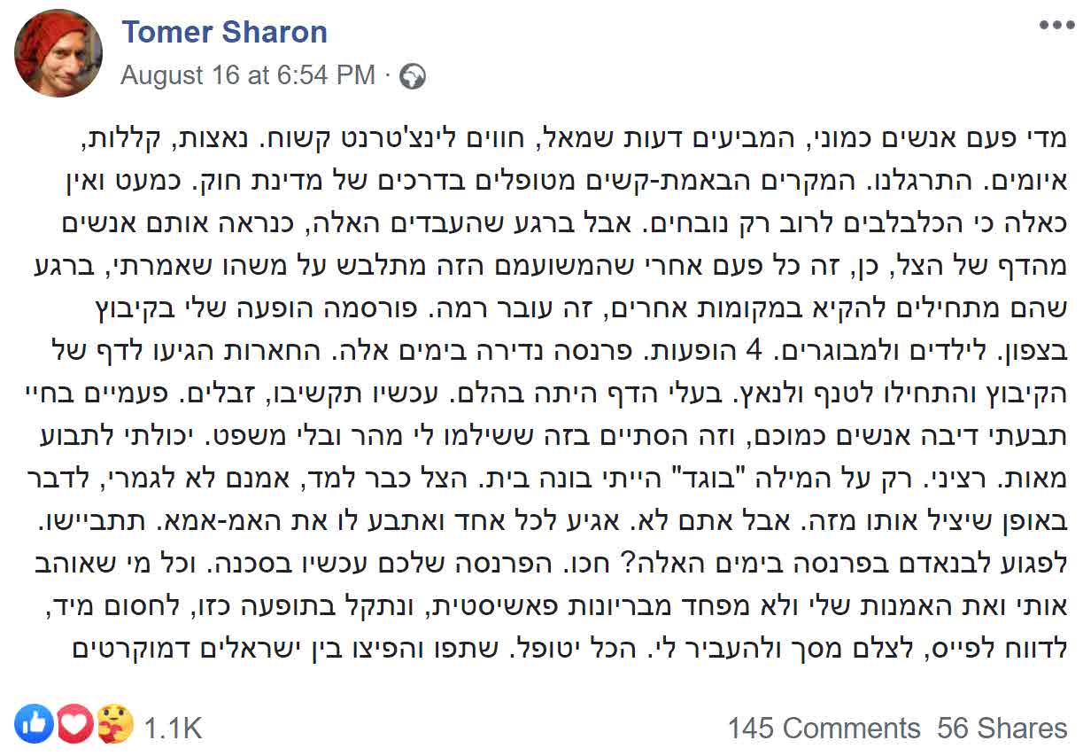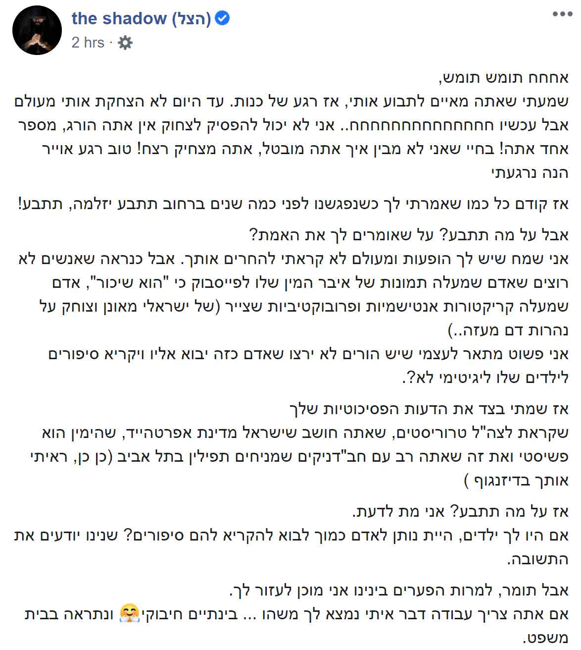 תומר שלא אהב את הגידופים והאש שספג בעקבות הפרסומים עליו העלה פוסט ביום ראשון בו בין היתר שיתף את עוקביו:"החארות הגיעו לדף של הקיבוץ והתחילו לטנף ולנאץ. בעלי הדף היתה בהלם. עכשיו תקשיבו, זבלים. פעמיים בחיי תבעתי דיבה אנשים כמוכם, וזה הסתיים בזה ששילמו לי מהר ובלי משפט. יכולתי לתבוע מאות. רציני. רק על המילה "בוגד" הייתי בונה בית. הצל כבר למד, אמנם לא לגמרי, לדבר באופן שיציל אותו מזה. אבל אתם לא. אגיע לכל אחד ואתבע לו את האמ-אמא. תתביישו."