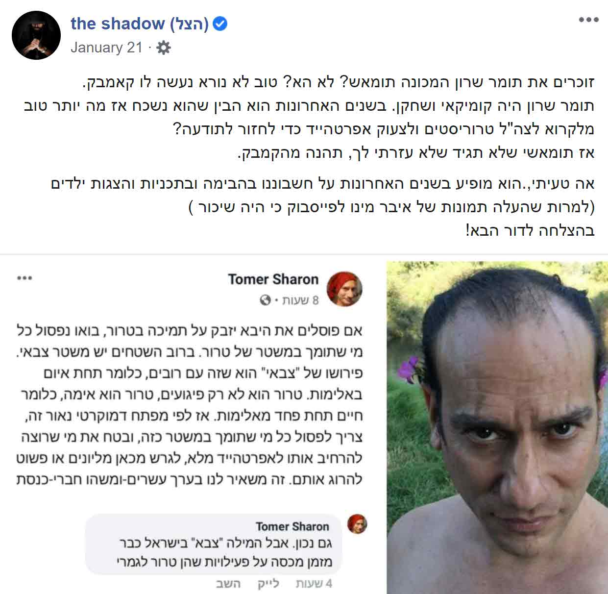 הצל כמובן שנתן תגובה לפוסט על זה של שרון אותו העלה לעמוד הפייסבוק שלו שמונה כקרוב לחצי מיליון עוקבים:"תומר שרון 'האומן' דורש שיחזרו את התמונה של מוות ליהודים" הוא כתב בשיתוף הפוסט של שרון והוסיף ניתוח פסיכולוגי מעמיק לצד המלצה:"אז תומר, אני יודע שאתה לא בריא ואני מאחל לך רק בריאות ואני אומר את זה מדאגה, אתה צריך או להגביר מינון או להחליף תרופה, המצב שלך לא טוב פוקי".