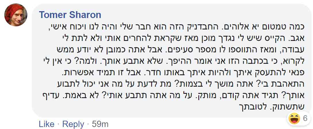 תומר שהספיק להגיב לפוסט הזה בדף של הצל מהיום הבהיר שהוא בכלל לא התכוון לאיים לתבוע אותו בפוסט האחרון: